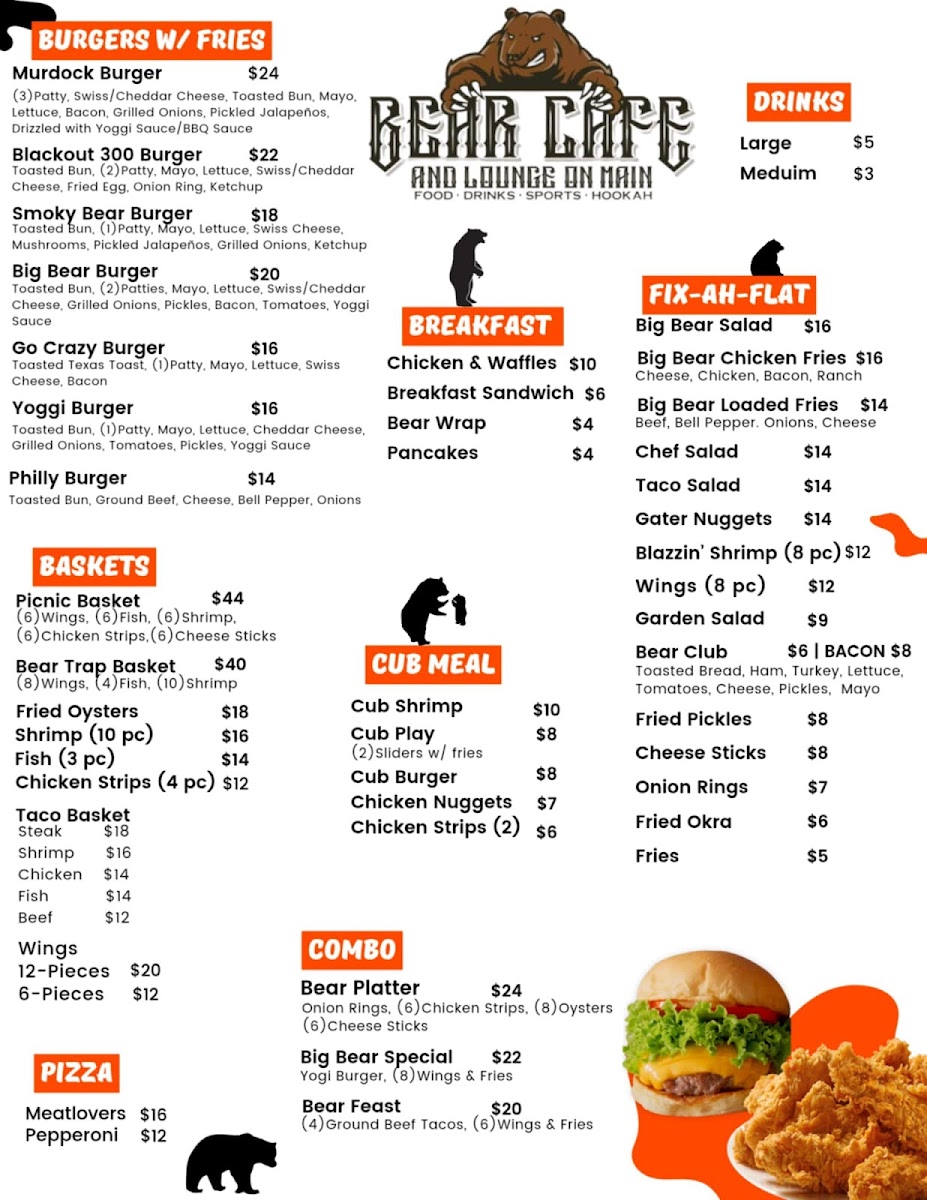 The menu at Bear Cafe And Lounge On Main strikes a satisfying balance between comfort food and casual seafood favorites, making it easy to find something appealing no matter your mood. Meat-free options like the Veggie Burger & Onion Rings and the heartier Veggie Burger Basket w Fries & Fried Okra stand out for offering generous portions and familiar flavors without feeling repetitive. Seafood lovers are well taken care of with choices such as Shrimp Tacos, Fried Shrimp, and broader Seafood selections that feel approachable rather than overly complicated. Dishes like the Shrimp Quesadilla & Grilled Veggies blend freshness with indulgence, while classics such as the Club Sandwich, Cuban Sandwich, and even a simple Corn Dog round out the menu with comforting, no-frills appeal. Overall, the menu feels thoughtfully put together, focusing on crowd-pleasing items that are easy to enjoy, well-priced for casual dining, and reflective of a relaxed café and lounge experience.